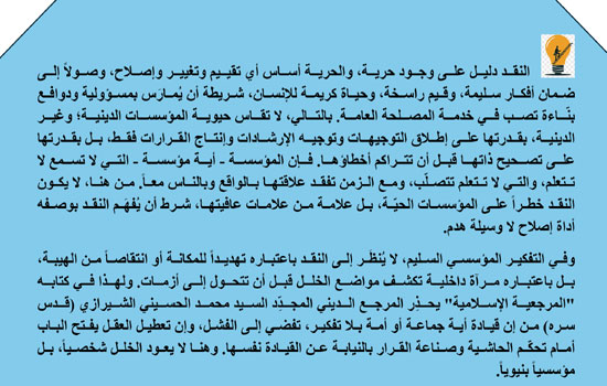 ------------------------------ (*) النقد دليل على وجود حرية، والحرية أساس أي تقييم وتغيير وإصلاح، وصولاً إلى ضمان أفكار سليمة، وقيم راسخة، وحياة كريمة، شريطة أن يُمارَس بمسؤولية ودوافع بنّاءة تصب في خدمة المصلحة العامة. بالتالي، لا تقاس حيوية المؤسسات الدينية؛ وغير الدينية، بقدرتها على إطلاق التوجيهات وتوجيه الإرشادات وإنتاج القرارات فقط، بل بقدرتها على تصحيح ذاتها قبل أن تتراكم أخطاؤها. فإن المؤسسة - أية مؤسسة - التي لا تسمع لا تتعلم، والتي لا تتعلم تتصلّب، ومع الزمن تفقد علاقتها بالواقع وبالناس معاً. من هنا، لا يكون النقد خطراً على المؤسسات الحيّة، بل علامة من علامات عافيتها، شرط أن يُفهَم النقد بوصفه أداة إصلاح لا وسيلة هدم. وفي التفكير المؤسسي السليم، لا يُنظَر إلى النقد باعتباره تهديداً للمكانة أو انتقاصاً من الهيبة، بل باعتباره مرآة داخلية تكشف مواضع الخلل قبل أن تتحول إلى أزمات. ولهذا في كتابه "المرجعية الإسلامية" يحذِر المرجع الديني المجدِّد السيد محمد الحسيني الشيرازي (قدس سره) من إن قيادة أي جماعة أو أمة بلا تفكير، تفضي إلى الفشل، وإن تعطيل العقل يفتح الباب أمام تحكّم الحاشية وصناعة القرار بالنيابة عن القيادة نفسها. وهنا لا يعود الخلل شخصياً، بل مؤسسياً بنيوياً. |